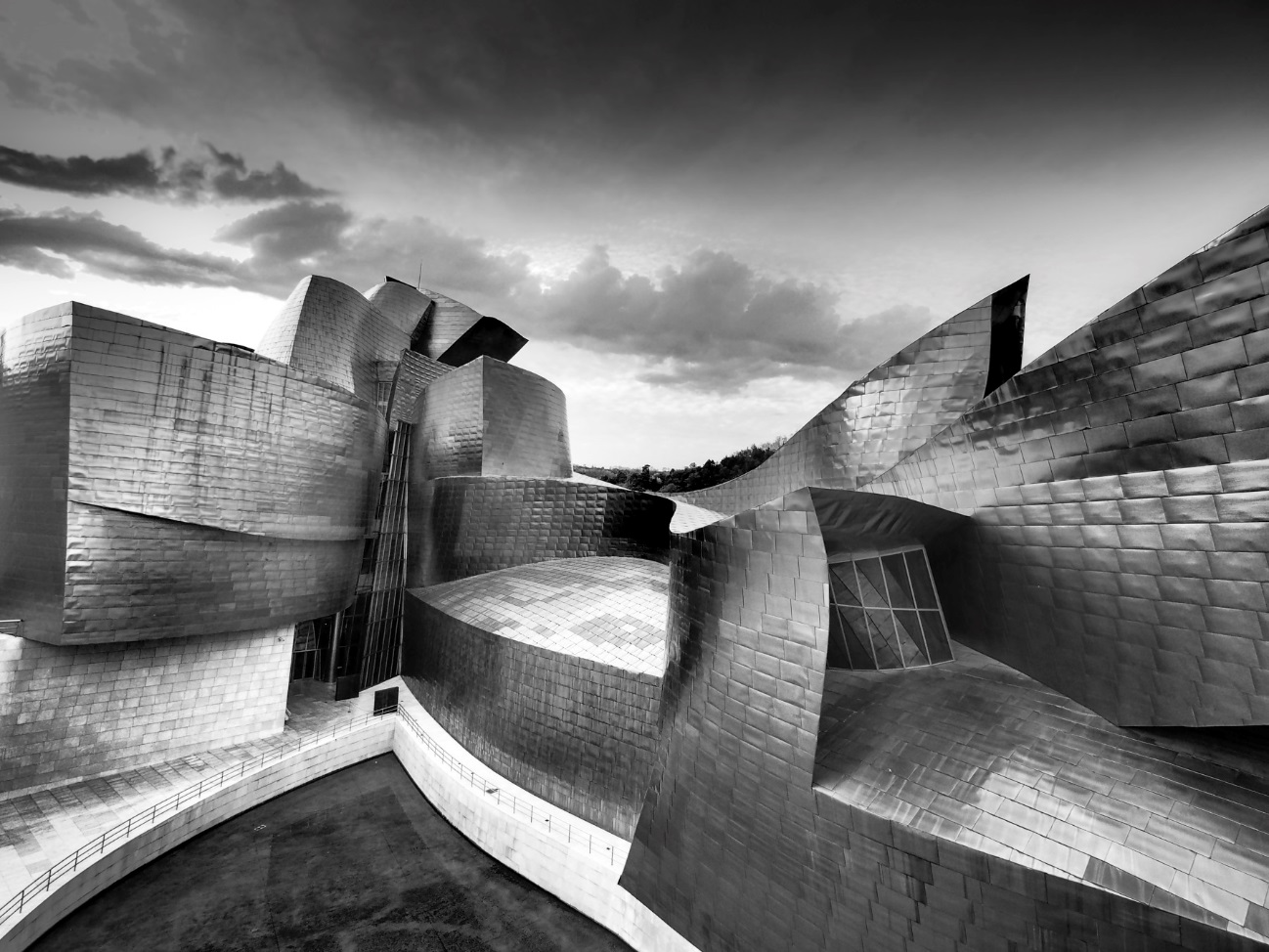 Das Guggenheim Museum in Bilbao: es wurde 1997 durch den spanischen König Juan Carlos I eingeweiht und ist ein Museum zeitgenössischer Kunst. Es befindet sich am Ufer der Ría von Bilbao. Sein auffälligstes Merkmal ist das innovative Gebäude selbst, das aus geschwungenen und gekrümmten Formen aus Kalkstein, Glas und Titanplatten. Vom Fluss aus ähnelt seine Form einem Schiff und erinnert an die wichtige Rolle Bilbaos als Hafenstadt und wenn man es von oben aus betrachtet, dann besitzt das Gebäude die Form einer Blume.
